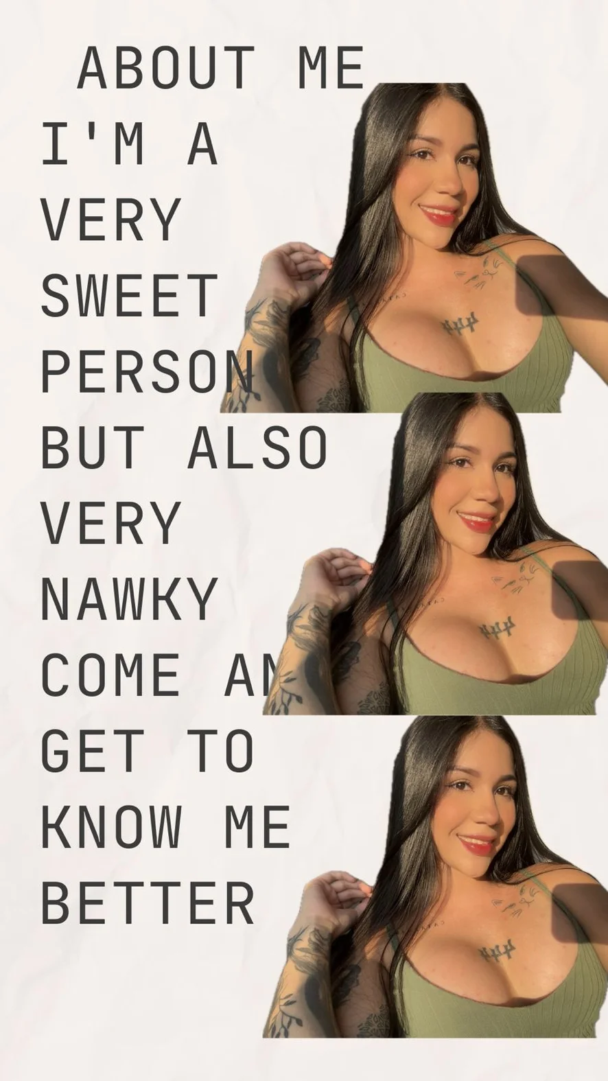 Ahegao, Spanking, Ocjenjivanje kurca, Kostimi, Show s uljem, Twerk, Pseća poza, Erotski ples, Camel Toe, Prstenjanje, Prljavi razgovor, Striptiz, Masturbacija, Dildo ili vibrator, Duboko grlo, Igra uloga, Tittyfuck, Orgazam, Hardcore, Kaubojka